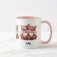 Uma caneca com uma imagem adorável de 2 raposas vestindo óculos cardíacos agudos de cor rosa. Decorado com sotaques cardíacos.
