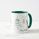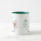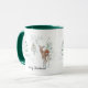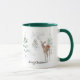 Esta caneca de Natal ou de Natal apresenta um desenho caprichoso de um veado que caminha através de uma floresta de pinheiros nevados. O veado está vestindo um nariz vermelho e algumas árvores estão decoradas. O texto da mensagem Feriado é totalmente personalizável para que você possa substituir a sua própria saudação ou adicionar seu nome. Arte original. Copyright Leah Wiedemer.