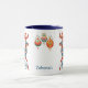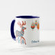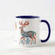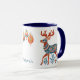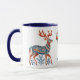 Esta é uma caneca de monograma atraente que é perfeita para a temporada de Férias e todo o inverno. Ele apresenta um veado ou rena com uma bonito banha azul e um padrão nórdico de ferrugem. A imagem é impressa duas vezes na caneca, com um trio de bolbos de árvore decorados pendurados entre eles. Seu monograma ou nome está em azul-lacrimejo no fundo central.