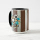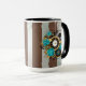 Relógio antigo e patenteado, adornado com joias, mãos de ouro e algarismos latinos com rosa de turquesa sobre fundo castanho e listrado. Estilo Steampunk.