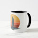 A vintage 70s-style sunset with a single surfboard silhouette.
