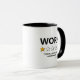 Engraçada caneca do escritório com a palavra "TRABALHO", com 1 em 5 estrelas, uma crítica ruim dizendo "terrível, não recomendaria", e seu nome.