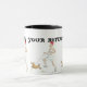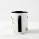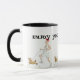 Uma caneca branca com uma jante preta e uma alça e um desenho de caneta e lavagem de uma corrida de um idoso com seu cachorro. Na camisa dele estão as palavras "Rewired, not Recansed" e logo abaixo da borda da caneca estão as palavras "Enjoe sua aposentadoria" a preto. Também está disponível uma camiseta e um cartão de saudação correspondentes.