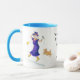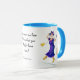 Uma caneca branca com jante azul em pó e alça e uma citação de George Eliot, 'Nunca é tarde demais para ser o que você poderia ter sido', ilustrada por uma pintura aquarela de uma mulher mais velha dançando e cantando. Cartões de saudação correspondentes também disponíveis