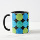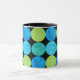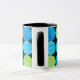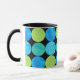 Uma caneca branca com lábio e alça pretos e um padrão abstrato de 'Luas Azuis' em azul brilhante e verde neon em fundo preto; de um design de colagem de papel pintado à mão por Judy Adamson.