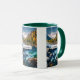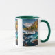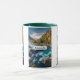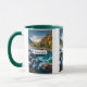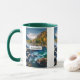 Uma caneca com uma fotografia cênica com árvore cobriu montanhas em cores do outono. Um rio vibrante corre em torno de uma multidão de rochas. Uma grande lua branca de cheio paira acima.