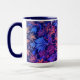 O padrão digital apresenta um intricado design de rococó, misturando tons avermelhados e azuis-claros em uma interação harmoniosa. As pétalas decorativas giram e se entrelaçam, criando uma sensação de profundidade e movimento, lembrando a arte ornamentado do estilo rococó. Esta paleta de cores vibrante melhora a elegância do padrão.