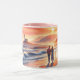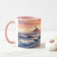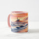 A dreamy coastal scene unfolds at golden hour, where a couple strolls along the shoreline beneath a glowing sunset and a distant lighthouse. Soft pastel skies blend coral, peach, and warm amber tones with rolling ocean waves, creating a tranquil, romantic atmosphere. The painterly style feels whimsical and cozy, evoking cottagecore and coastal folk aesthetics with a gentle sense of wander and togetherness. AI generated artwork.