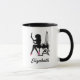 Personalize adicionando seu nome a esta caneca chique e à moda com uma silhueta de uma mulher da forma, vestindo calçados curados elevação do rosa quente com os arcos bonitos, sentando-se em uma vaidade da composição e admirando sua reflexão feminino do fashionista em um espelho.