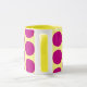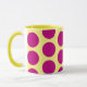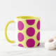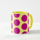 Minha arte digital original nesta caneca apresenta um padrão de bolinhas cor-de-rosa magenta em um fundo amarelo-limão para um estilo artístico. A dentro da caneca e a alça estão em tom amarelo para complementar o trabalho de arte. As cores e o padrão têm uma vibração retrô para um toque clássico. Estas são canecas de 11 onças (mas podem ser maiores se desejado), apenas do tamanho perfeito para o café ou chá da sua casa - ou mesmo chocolate quente! Ele faria um presente de excelente e você poderia colocar pacotes de café, bolsas de chá ou dentro de chocolate quente. Uma outra ideia de presente é colocar uma pequena planta nela para torná-la mais especial para o seu amado.