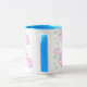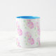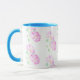 Uma bonito caneca branca com lábio e alça azul em pó, coberta de rosas cor-de-rosa, de uma pintura aquosa de Judy Adamson. Cartões de saudação correspondentes também disponíveis.