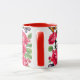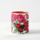 Uma caneca vermelha acentuada com fundo branco com rosas vermelhas e borboletas.