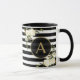 Dê esta caneca como um presente de luxo elegante, ou a comprar para você mesmo! Esta caneca rica em monograma, em forma de listras, a preto e branco, apresenta um elemento de fundo monograma em círculo preto, junto com ouro rico, e o design é embelezado com belos rosas brancos de aquarela e delicada folhagem verde de outono. A design é a mesma de ambos os lados, então é perfeita para todos. Esta design luxuosa faria um presente de excelente para ela, ou um bom presente para si.