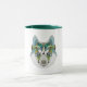 Ilustração como gráfico da face de um lobo/rouco com embelezamentos verdes e azuis