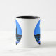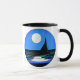 Mug em uma silhueta preta de um veleiro contra o céu noturno com lua e estrelas, refletida na água