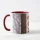 Uma caneca de orquestra inspiradora retrata uma simples fotografia natural com um galho de folhas de laranja queimadas e de outono vermelho em uma floresta de árvores. Apresenta uma parte da Bíblia Verse Psalm 147:3, "Ele cura o coração partido." Foto de Simon Berger. *