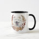 Uma bonito coroa de outono em tons de cinamão marrom, bronzeado e creme rodeia a imagem aquosa de um lindo Cão Samoyed branco. A imagem é impressa duas vezes na caneca, com seu texto personalizado entre eles.