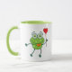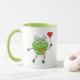 Sapo leggy verde com os olhos inflando engraçados e cabeça grande ao sorrir generosa, ao andar unsteadily, ao colar sua língua para fora, ao guardarar o balão vermelho do coração e ao senti-lo louca no amor