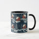 This striking coffee mug features a bold, seamless repeating pattern inspired by traditional Scandinavian folk art. The illustration depicts cozy red cottages and stylized evergreen trees against a dark, snowy background. The high-contrast design creates a warm and nostalgic winter atmosphere, perfect for curling up by the fire. This unique mug is a lovely holiday gift for those who cherish Nordic design, graphic patterns, or distinctive home décor during the winter season.