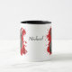 O retrato a cores da água de um Terrier escocês se destaca em relação a um fundo brilhante de pintura a abstrato vermelho. A imagem está em dois lados da caneca, com seu nome ou outro texto personalizado a preto entre eles.