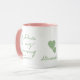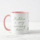 Uma linda caneca personalizada para uma mamãe que adora chá de mate. Seu pequeno tempo relaxante e energia para a maternidade é a bebida verde saudável. Script manuscrito para todo o texto, para a frase "Matcha é a minha mamãe" e para o nome personalizado. Típica de caligrafia de sábio deliciosa sobre fundo branco limpo e pequenos corações bonitos como símbolo de mamãe e criança. Parece excelente na caneca combo com dentro cor rosa-menina e a alça, ou outra cor, a seu desejo. Cozinha e comida de bebida para você ou como presente para outro entusiasta do chá matcha. Para aniversário, Natal, Dia das Mães ou só porque, como presente de amizade. Pode ser também uma caneca para ser usada em um grupo de mães, para beber juntos sua bebida favorita, a caneca de todos estará com o nome dela. Um presente personalizado cuidadoso com menos de 15 dólares para ela, mãe.