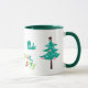 Esta caneca de férias única é brilhante e colorida, com tipografia que diz "EAT, DRINK, AND BE FELIZ". As cores utilizadas incluem verde limão, vermelho e azul lacrimogêneo. Acima do texto de cada lado está uma ave lacrimogênea. De um lado está uma árvore de Natal com bolbos azuis e cor-de-rosa pastel, e um chapéu de Papai Noel listrado do outro lado. Festivo! *O Clip art usado neste design é protegido por direitos autorais pela Encore Software, Inc., que permite o uso a seus licenciadores. Todos os direitos reservados.
