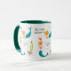 Uma caneca branca com lábio verde Hunter e com sereia, peixe e caranguejo eremita, de uma pintura aquosa de Judy Adamson. Você pode adicionar o nome do proprietário da caneca na caixa que as sereias estão segurando. Os cartões de saudação e presentes também estão disponíveis.