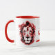 Uma caneca de dois tons impressa com o nome icônico S e Orisha Shango. Texto com design entre dois leões de cabeça em vermelho e preto.