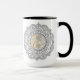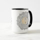 A symmetrical mandala design featuring intricate a yin yang floral pattern in gold and silver.