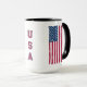 Volte e beba café com estilo a partir desta caneca fantástica, com um design de bandeira vertical dos EUA em cada lado, com o texto "EUA" no meio (também vertical—estávamos com um humor vertical!). O texto é preto, vermelho, branco e azul em várias camadas, com o vermelho na frente.