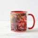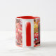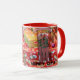 Uma foto de um trenó de Natal com uma coroa verde debaixo de uma árvore de Natal com presentes vermelhos. Isso é brilhante e colorido que está em um MUG.