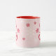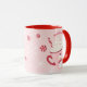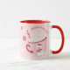 Uma caneca cheia de temas de Natal que faz um presente de Natal perfeito ou um gatilho. O design pode ser personalizado com o nome do seu filho e apresenta um design de chocolate quente de boneco de neve completo com chantilly, doces, doces de menta-pimenta e flocos de neve em rosa e vermelho.