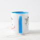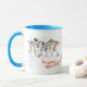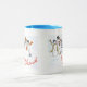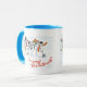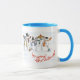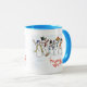 Uma caneca branca com jante azul em pó e alça e cinco bonecos de neve alegres na frente e atrás, de uma design de aquarela pintada à mão por Judy Adamson. Este design também está disponível como um cartão de Natal.