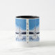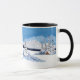 Uma caneca com uma bela cena de inverno, incluindo montanhas cobertas de neve, verdes e cabana rústica. As imagens e o texto podem ser personalizados, substituídos ou excluídos. Arte original por W.B.