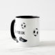 Add your own caption or a name to personalize this coffee mug, a special gift for any soccer player or fan (or British football!) The two-sided design has soccer balls and soccer boots.