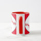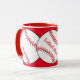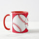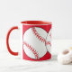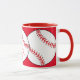 Esta caneca apresenta almôndegas brancas e vermelhas cercadas por um fundo vermelho. O texto diz: Mãe de Softball. Personalize facilmente o texto para um fã desportivo especial ou remova-o completamente. Excelente para Dia de as mães ou qualquer época do ano.