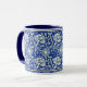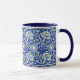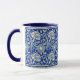 Esta caneca cerâmica apresenta uma massa de cravos de marfim e outras flores comuns de casaco espalhadas sobre, esquelador, contra um fundo azul de marinheiro médio, um padrão inspirado por um design de papel de parede favorito da era vitoriana.