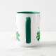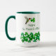 Cute St. Patrick's Day mug featuring a hand-painted ruby-throated hummingbird carrying a shamrock.
