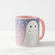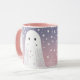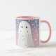 Um fantasma caprichoso flutua entre as estrelas cintilantes num céu decoroso de tons roxos e cor-de-rosa suave, cercado por delicados padrões de estrelas brancas.