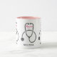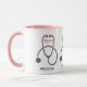 A personalized mug with "Nurse" written in a cool script font with a little pink heart underneath. Designed with a simple gray stethoscope illustration.