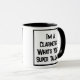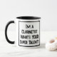 Um slogan engraçado numa caneca de café com dois tons que diz "Sou um Clarinetista. Qual é o seu super talento?" Dois Tone Coffee Mug para um Clarinetista ou alguém que toca clarinete. Texto preto e branco em negrito.