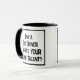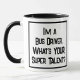 Um slogan engraçado numa caneca de dois tons que diz "Sou um motorista de ônibus. Qual é o seu super talento?". Duas canecas para um driver de barramento. Texto preto e branco em negrito.