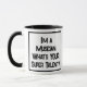 Mug para um músico. Um slogan engraçado numa caneca de café com dois tons que diz "Sou um músico. Qual é o seu super talento?" Duas Tone Coffee Mug para um músico ou alguém que toca música ou escreve música. Texto preto e branco em negrito.