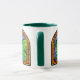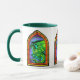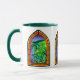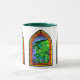 Uma caneca com um dragão feito no estilo de uma janela de vidro manchado.