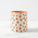 Esta caneca com tangerinas cor de laranja frescas sobre um fundo branco cheio de café ou chá matinal, é uma boa maneira de começar o seu dia.