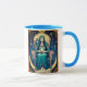 Mug in "The High Priestess", a tarot archetype, seated on an ornate throne, holding a glowing crystal. She wears an intricate headdress adorned with golden accents. An owl, symbolizing wisdom, perches beside her.