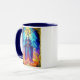 Mug in an illustration of The Magician tarot card symbolizing manifestation, power, and divine connection. Clad in radiant robes and framed by elemental fire and celestial light, he channels energy between heaven and earth. The infinity symbol above represents limitless potential and mastery. He embodies the will to create one’s own reality.