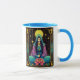 Mug in The High Priestess" tarot card, featuring a serene, meditative figure with a crescent moon on her forehead, holding a golden scepter. Surrounded by celestial symbols, a glowing halo, and a blooming lotus, it embodies intuition, wisdom, and spiritual awakening in intricate, mystical detail.