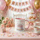 Taza de cerámica con diseño “Happy Birthday”, ideal para celebrar momentos especiales con estilo y dulzura. Presenta una ilustración delicada de una torta de cumpleaños en tonos pastel, acompañada de detalles festivos que transmiten alegría. Su interior y asa en color rosado le aportan un toque elegante y encantador. Perfecta como regalo original o para disfrutar tu bebida favorita en ocasiones especiales.
