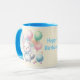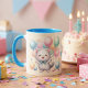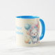 Taza de cerámica con diseño adorable de gatito rodeado de globos, perfecta para regalar en cumpleaños o sorprender a alguien especial. Su interior y asa en tono celeste le aportan un toque moderno y delicado. Ideal para disfrutar cualquier bebida favorita con un estilo dulce y alegre.